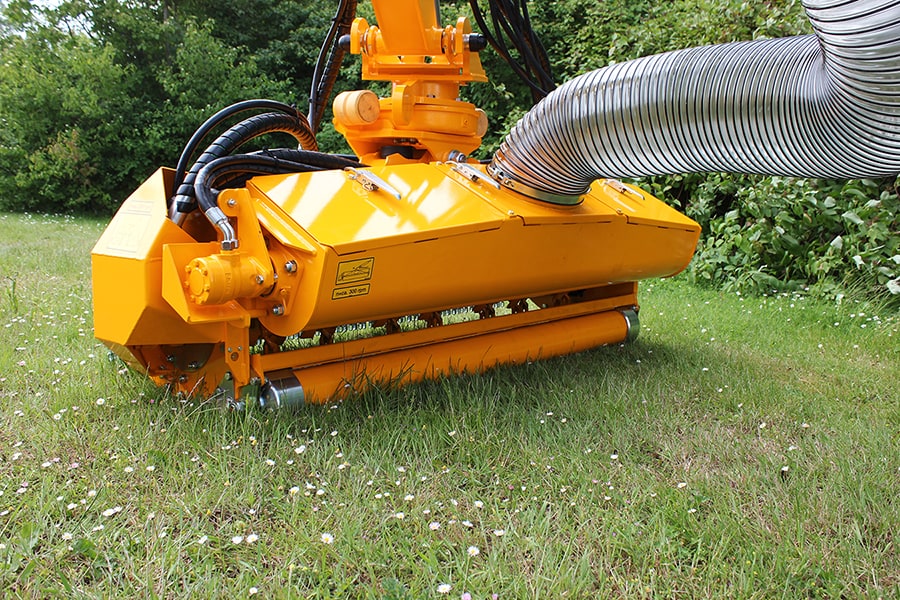 The Herder Ecomower is very versatile and can be coupled to various machines. Optionally, instead of a rubber safety flap, a conveyor belt unit or an auger unit can be mounted for lateral pass vegetation or for removal by means of a suction unit.