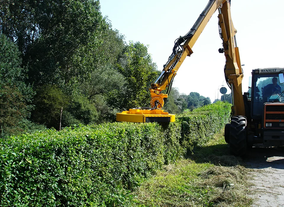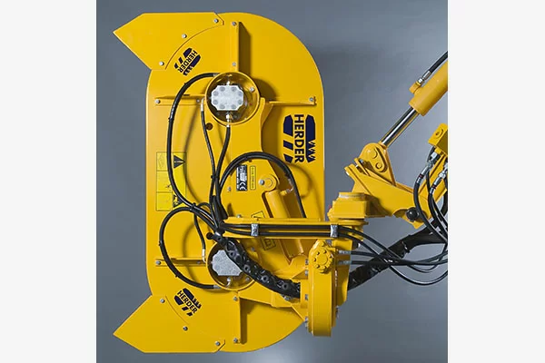 De heggenmaaier is geschikt voor het maaien en terugsnoeien van de houtachtige groei van heggen en bomen met een diameter tot 35 mm. In de behuizing van de maaier bevinden zich twee maaibladen, elk aangedreven door een eigen hydraulische motor om de vegetatie te snijden.